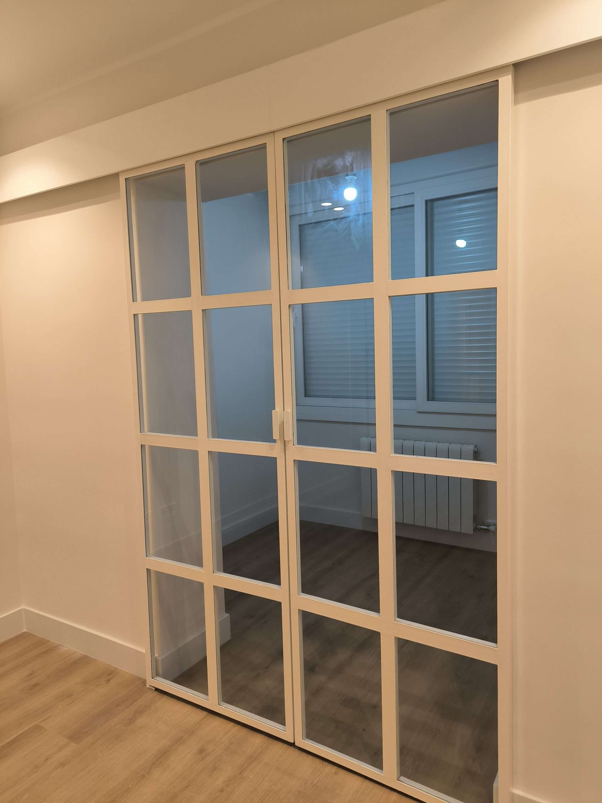 Salón con carpintería renovada: Instalamos unas elegantes puertas correderas de vidrio con cuadros, mejorando la estética y funcionalidad.